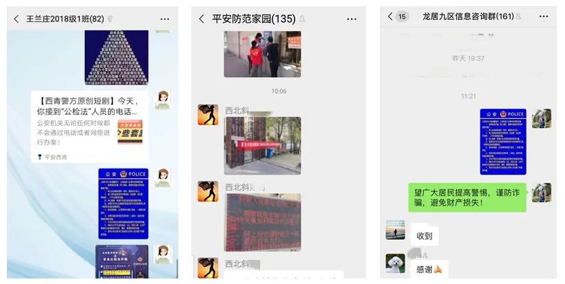 连日来,公安西青分局持续开展防范电信网络诈骗宣传活动,不断创新宣传载体,紧抓宣传黄金时段,拓宽宣传覆盖面,切实提升广大人民群众的识骗防骗能力,取得了初步成效。 丰富宣传载体,体现新颖性 视频“刷”不停。针对短视频形式新颖、短小精悍,易于为老百姓所喜闻乐见的特点,大寺派出所李庄子社区民警自编自播“四个凡是”宣传小视频,推送至社区居民微信群中,收获居民关注点赞,反响热烈。 喇叭“喊”不停。大寺派出所、西营门派出所民警将录音播放器固定在巡逻电动车、警车上,在开展巡逻的同时播放提前录制的反诈音频; 大寺派出所 ![]() 西营门派出所 大寺派出所民警录制“带您识破电诈之‘冒充公检法’诈骗”,中北派出所民警录制“防范电信网络诈骗10条温馨提示”,在社区、村口大喇叭中滚动播放,提升宣传针对性。喇叭播放时间主要集中在上午和傍晚等人员流动频繁时段,既提升宣传实效,又不影响群众休息。 ![]() 微信“推”不停。李七庄派出所、中北派出所、大寺派出所等基层派出所充分借助社区居民微信群、师生家长微信群等平台载体,将精心编辑的反诈宣传内容推送至群中,便于群众及时了解当前电诈案件发案特点及作案手法,切实提高自身防范意识和能力。 ![]() 抓住重点时段,突出精准性 抢抓上午“黄金时段” 利用上午沿街店铺经营黄金时间以及顾客人流较为密集的时间段,张家窝派出所由所领导带队,分成8个反诈宣传组,对祥和大道两侧、知景道两侧、董庄子商业街等门脸店铺开展“踩街式”宣传,做到不漏一家、不留死角。 ![]() 整合午晚餐“休闲时段” 西青开发区派出所充分利用午餐、晚餐时段,深入辖区永旺大型购物中心,特别是餐馆周边,张贴宣传海报,开展“餐桌”讲堂,发放防骗宣传资料,实现宣传阵地前移。 ![]()
