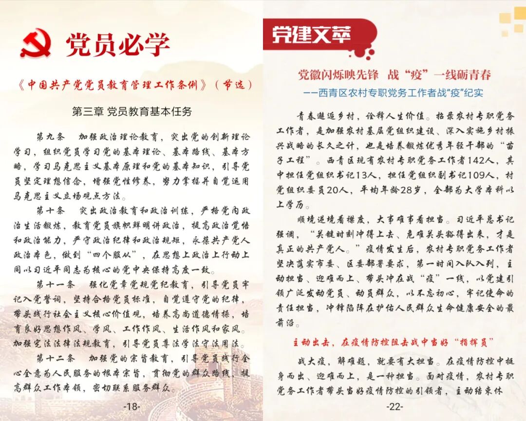 习近平总书记强调要紧扣党员思想行为特征开展工作,积极探索有利于破解难题的新途径新办法,积极探索信息化条件下开展工作的新载体新路数。针对突如其来的新冠肺炎疫情,西青区委组织部积极探索运用信息化手段,精心打造党员线上学习平台,设计制作了党建电子期刊《西青党建·小红书》,确保疫情期间党员教育“不断线”。