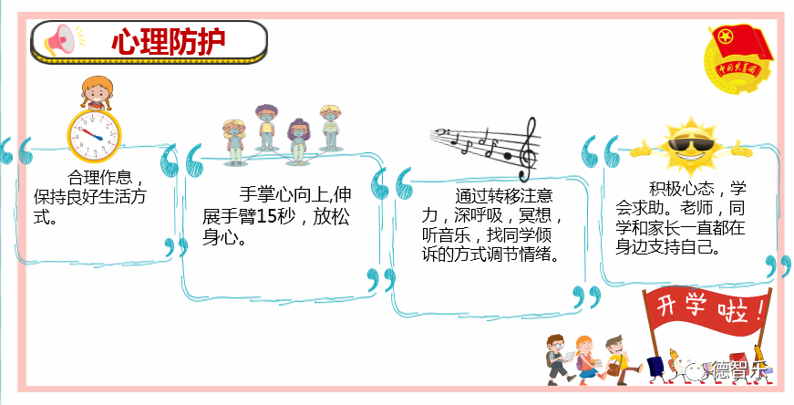 编者按:经历了“超长寒假”之后,4月20日,西青区初三、高三毕业班即将开学复课。为贯彻落实区委和团市委关于共青团组织要在疫情期间“停课不停学”以及初高三学生首批复学的应急调适工作中发挥积极作用的要求,团区委联合民非社会组织——西青区德智乐家庭成长指导中心充分发挥专业优势,策划了系列线上辅导微课堂,为初高三毕业生顺利度过复学过渡期以及其他青少年学生更好适应居家学习提供指导服务。下面,就随小编一起学习第一讲的内容吧~ 团团小课堂:复学第一课--阳光心态进校园 ![]() 又是一个开学季,亲爱的同学们,你做好准备了吗?在过去的2个月,在全国人民万众一心的努力下,疫情已经得到控制,重返校园的我们需要做什么呢? 养成良好习惯 疫情虽然已经得到控制,疫情给我们发出的警报应当长鸣,珍惜生命,每个人做好自己健康的第一责任人,健康的身体,是我们高效学习的重要基础。充足的睡眠,规律的作息,坚持良好的生活方式和运动习惯很重要。 ![]() 身体防护 我们要佩戴口罩进入校园,配合学校老师测量体温,和同学保持1米以上的距离,不要拥挤,打喷嚏时用纸巾或衣袖挡住口鼻,可以保护他人避免飞沫的污染,七步洗手勤做到,要把手的各个手指各个面都要洗到,认真学习防控小知识,下课如果要去洗手间记得要用洗手液,流动水洗手,有效防止病毒随着手进入体内。坚持个人防护要做到。 ![]() 心理防护 阳光心态是身体防护的良药。学习生活难免遇到困难,出现负性情绪是人体自身的预警和正常反应,要及时观察、合理的调节情绪,通过转移注意力,听音乐,寻求帮助的方式进行宣泄。还可以通过肢体动作调整心态:将手掌心朝上展开,然后保持这个姿势15秒,只需要15秒,就能注意到自己的心态更加开放了。记住,你不是自己在战斗,还有老师,同学和家长的帮助和支持哦! ![]() 心情好 多锻炼 不扎堆 对保持身体的战斗力最有用! 张海迪说:“如果生命是一盏灯,那将之点亮的是我们对每个日子的热爱,和对未来的憧憬...”新学期来临,希望同学们都能在新的学习道路上,收获最美的自己。 主讲老师:李思融 国家二级心理咨询师 德智乐家庭成长指导中心辅导老师 ![]() 德智乐家庭成长指导中心成立于2018年6月,指导单位为西青团区委,该民非组织自成立以来一直专注于教育领域,以”做青少年心理健康承担者”为使命,坚持家、校、社三方联动,在学校、社区与企事业单位开展家长课堂、学生心理学知识的普及与推广工作,为提升青少年心理健康素养而努力! |