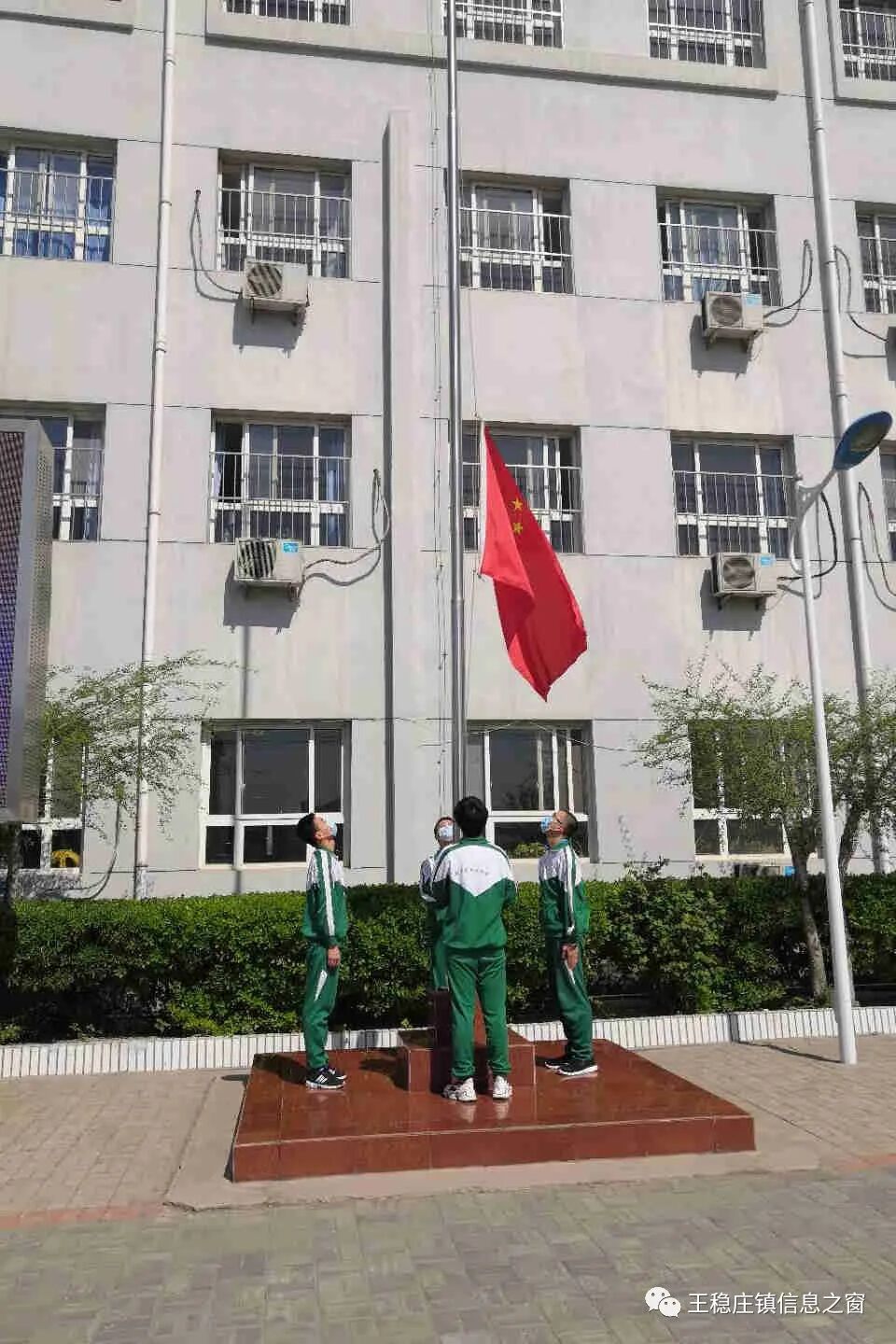 上午9:40,伴随着雄壮的国歌声,鲜艳的五星红旗在王稳庄中学的校园上空冉冉升起。全体九年级的学生参加这次现场升旗仪式。与此同时,七、八年级还组织学生在家里同步观看升旗仪式。不同的地点,相同的仪式,孩子们的爱国热情丝毫未减。