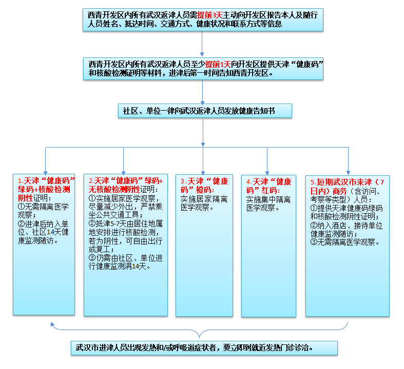 1.西青开发区内所有武汉返津人员需提前3天主动向开发区报告本人及随行人员姓名、抵达时间、交通方式、健康状况和联系方式等信息。
