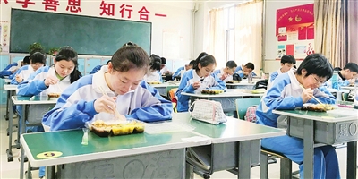 12点10分,学生们经过一上午的紧张学习后,心满意足地吃起午饭。为了避免学生聚集,学校将营养午餐送到每个班里,学生在分批错时洗手消毒后,在教室里统一就餐。