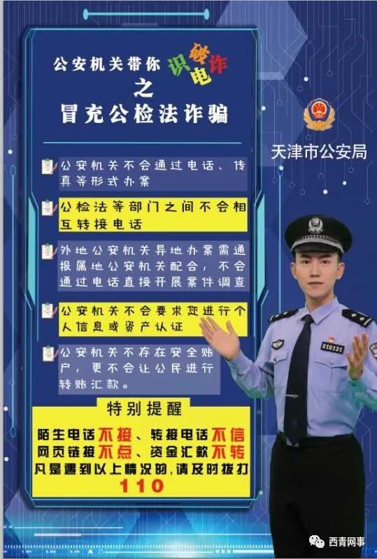 公安西青分局反电信诈骗专班教您防被骗 公安西青分局反电信诈骗专班教您防被骗之“牢记五个一律” 1、只要对方自称警察、检察官、法官说你犯罪了,又要你银行卡号、验证码或者让你转钱的,一律都是诈骗。 2、只要对方提到刷单、贷款、中奖这些字眼,又要你银行卡号、验证码或者让你转钱的,一律都是诈骗。 3、只要对方自称商城客服要给你退钱,又要你银行卡号、验证码或者让你转钱的,一律都是诈骗。 4、只要对方自称领导、老板、老师、熟人,之后不接你电话,又要你银行卡号、验证码或者让你转钱的,一律都是诈骗。 5、只要航空公司说你机票需要退、改、签,又要你银行卡号、验证码或者让你转钱的,一律都是诈骗。 以上一律都是电信诈骗,大家只要记住五个一律,就是捂住了自己的钱袋子,实在分不清的,请拨打110。 公安西青分局反电信诈骗专班教您防被骗之“防范冒充公检法诈骗” 骗局:骗子冒充警察、检察官、法官打电话说你犯罪了,然后利用微信、QQ、传真等给你发送“通缉令”,最后以资金核查为名让你把钱转到“安全账户”或者让你提供银行卡号和验证码骗你的钱。 防骗小贴士: 警察、检察官、法官在办案中不会用电话告诉你犯罪了,不会用微信、QQ、传真等传送“通缉令”,更没有什么“安全账户”也不会让你转账进行资产核查。遇到这种情况及时拨打110报警。 ![]() ![]() 公安西青分局反电信诈骗专班教您防被骗之“防范网络刷单诈骗” 骗局:骗子冒充商家发布招聘刷单员广告,商定和你进行虚假购物交易提高商家信誉度,并向你支付佣金,第一笔交易会支付佣金骗取你的信任,之后你再转账就会拉黑你。 防骗小贴士: 虚假交易提高商家信誉度本身就是欺骗消费者的违法行为,骗子就是抓住人们想要轻松赚钱的想法对你“放长线钓大鱼”,请记住一切网络刷单就是诈骗。 公安西青分局反电信诈骗专班教您防被骗之“防范网络贷款诈骗” 骗局:骗子冒充贷款公司或者银行人员承诺为你办理无息贷款,之后让你缴纳手续费、保证金等费用,或者让你提供银行卡号和验证码把你的钱骗走。 防骗小贴士: 要想贷款就通过银行或者注册的贷款公司等正规渠道,不要轻易下载贷款APP,如果对方让你缴纳手续费、保证金等,或者让你提供银行卡号和验证码,要马上切断与对方的联系并报警。 ![]() 公安西青分局反电信诈骗专班教您防被骗之“防范网络赌博、投资诈骗” 骗局:骗子先跟你交网友,之后说带你挣钱向你推荐赌博网站和投资网站,等你充钱之后骗子就会在网站后台操纵你账户的涨落,先让你看到挣钱的希望给你点“甜头”,之后诱导你大量转账,最后把你的钱都骗走。 防骗小贴士: 骗子正是利用人们想要赚钱的心理,所以不要轻易通过网络与素未谋面的人一起投资,防止“占小便宜吃大亏” 公安西青分局反电信诈骗专班教您防被骗之“防范冒充客服诈骗” 骗局:骗子冒充网络商城客服人员,说你网络购物失败或者商品断货,退还你货款,之后让你缴纳手续费、保证金等费用或者让你提供银行卡和验证码,最后骗你的钱。 防骗小贴士: 一旦接到这种电话,要及时通过你购物的商城同你购物的店家进行联系确认,自己银行卡号和验证码绝对不能向对方提供。 |