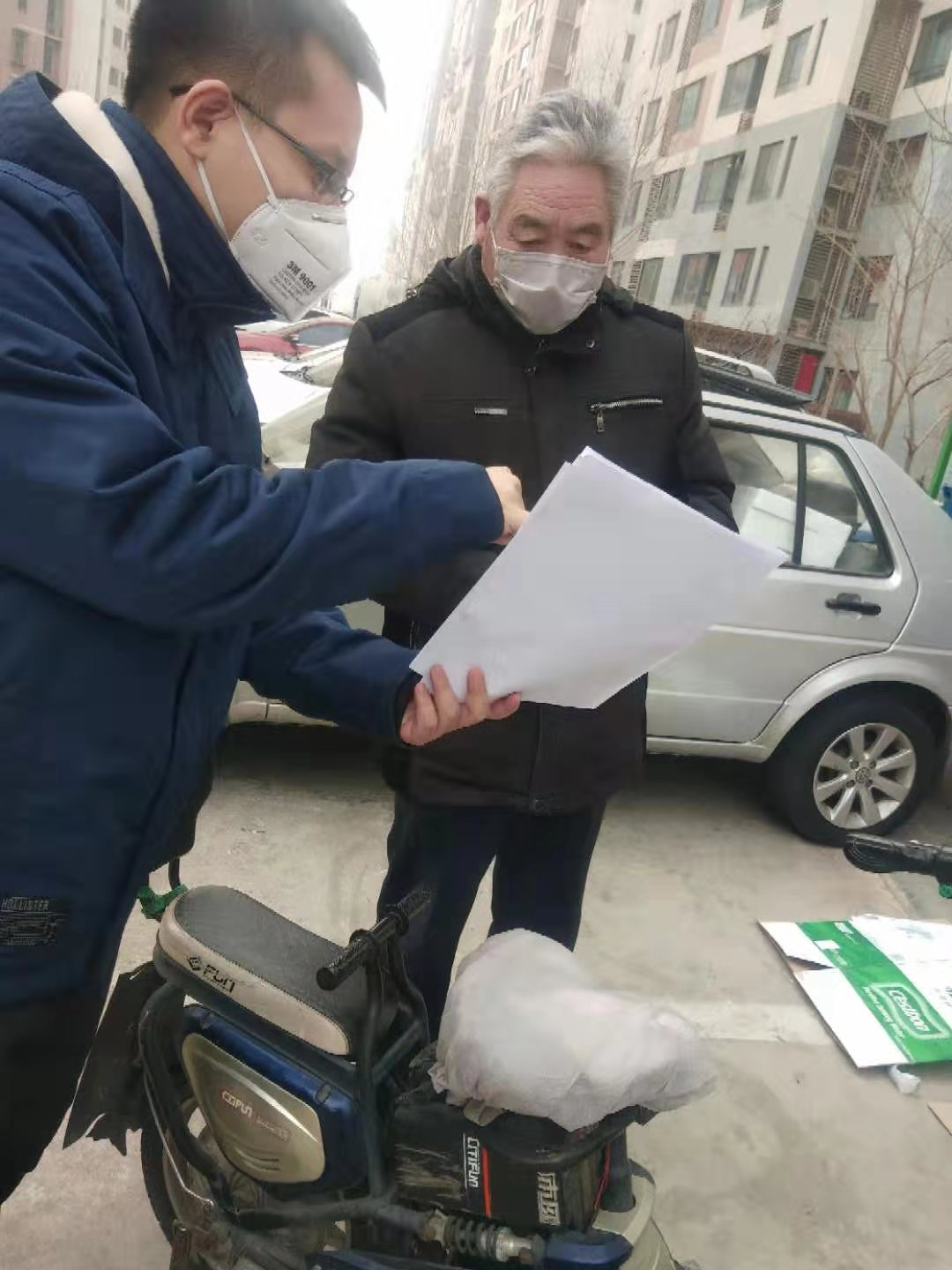 作为一名物业管理员,在防疫期间与物业沟通协调也是王飞的日常工作之一。通过微信、电话与实地走访相结合的方式,王飞将疫情防控的相关部署传达给物业,同时与物业工作人员一起发放宣传单,张贴宣传海报,并及时将物业遇到的难题反馈到居委会协调解决。