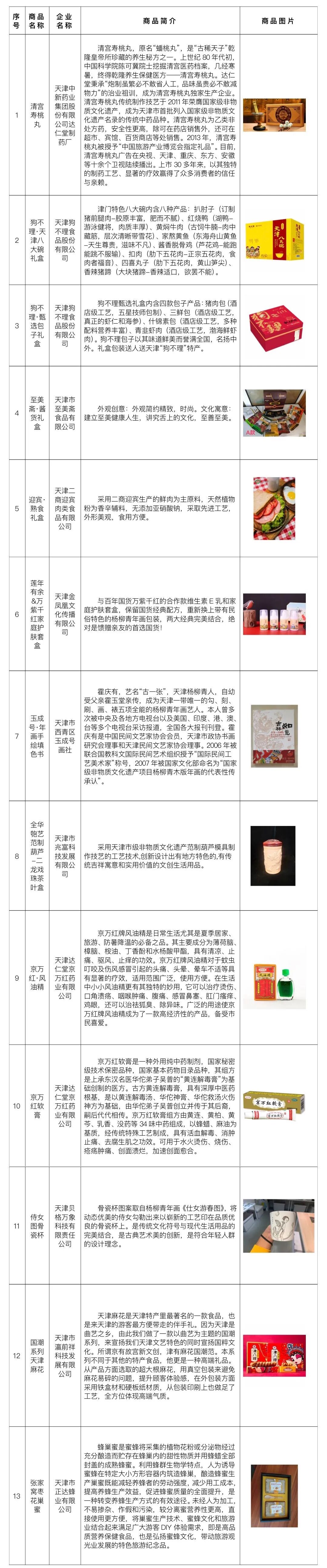 13件入选商品件件独具匠心、可圈可点,有非遗技艺创新商品,如玉成号·年画手绘填色书、全华匏艺范制葫芦二龙戏珠茶叶盒,有将文化符号巧妙植入商品的文创,如创意系列国潮麻花、莲年有余&万紫千红家庭护肤套盒、侍女图骨瓷杯,有彰显工业文明的制药技艺,如京万红风油精、软膏、清宫寿桃丸,有享津门美誉的传统老品牌,如狗不理包子礼盒、至美斋酱货礼盒、迎宾熟食礼盒,还有张家窝特色农产品枣花巢蜜,西青良好的营商环境让优秀企业遍地开花。