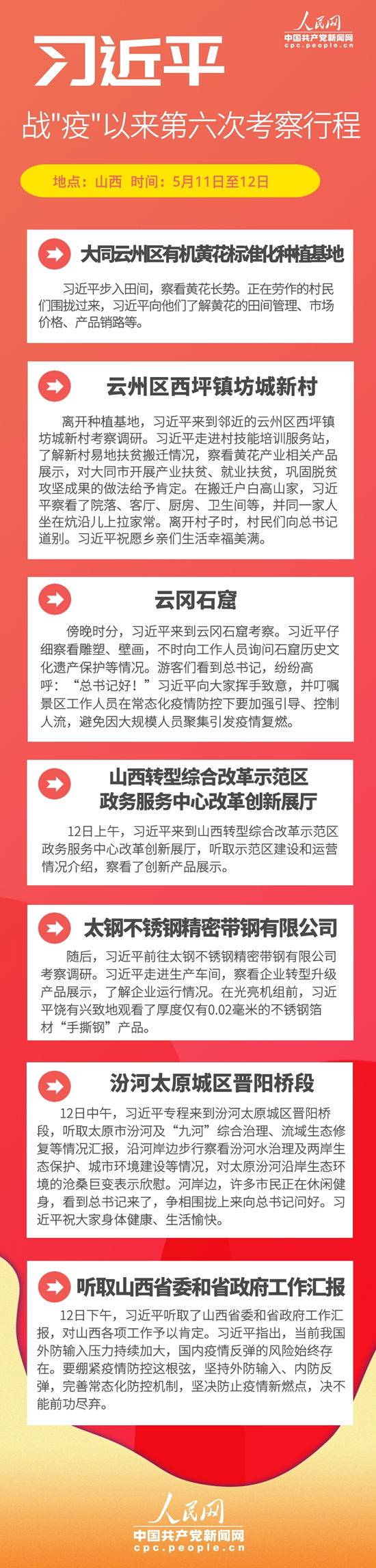 5月11日至12日,中共中央总书记、国家主席、中央军委主席习近平赴山西大同、太原等地,深入农业产业基地、移民新村、文物保护单位、改革示范区和企业等,就统筹推进常态化疫情防控和经济社会发展工作、巩固脱贫攻坚成果进行调研。 这是自疫情发生以来,习近平总书记第六次亲赴一线考察调研。 一个省份、两天一夜、近十个考察点,习近平总书记行程满、连轴转。又值2020年全国两会即将召开之际,总书记此次考察针对哪些问题作出重要部署?人民网·中国共产党新闻网用这些关键词为您梳理。 两会前夕赴山西考察 习近平步入田间察看黄花长势 脱贫攻坚 ——“要千方百计巩固好脱贫攻坚成果” ●乡亲们脱贫后,我最关心的是如何巩固脱贫、防止返贫,确保乡亲们持续增收致富。希望把黄花产业保护好、发展好,做成大产业,做成全国知名品牌,让黄花成为乡亲们的“致富花”。 ——5月11日,在大同市云州区考察有机黄花标准化种植基地时的讲话 ●易地搬迁不仅是为了解决住得好的问题,更是为了群众能致富。 ——5月11日,在大同市云州区西坪镇坊城新村考察调研时的讲话 ●今年是决战决胜脱贫攻坚和全面建成小康社会的收官之年,要千方百计巩固好脱贫攻坚成果,接下来要把乡村振兴这篇文章做好,让乡亲们生活越来越美好。 ——5月11日,在大同市云州区西坪镇坊城新村考察调研时的讲话 ●要做好剩余贫困人口脱贫工作,做好易地扶贫搬迁后续扶持,强化返贫监测预警和动态帮扶,推动脱贫攻坚和乡村振兴有机衔接。 ——5月12日,在听取山西省委和省政府工作汇报时的讲话 文化自信 ——“让旅游成为人们感悟中华文化、增强文化自信的过程” ●历史文化遗产是不可再生、不可替代的宝贵资源,要始终把保护放在第一位。 ——5月11日,在云冈石窟考察时的讲话 ●发展旅游要以保护为前提,不能过度商业化,让旅游成为人们感悟中华文化、增强文化自信的过程。 ——5月11日,在云冈石窟考察时的讲话 ●要充分挖掘和利用丰富多彩的历史文化、红色文化资源加强文化建设,坚持不懈开展社会主义核心价值观宣传教育,深入挖掘优秀传统文化,引导广大干部群众提升道德情操、树立良好风尚、增强文化自信。 ——5月12日,在听取山西省委和省政府工作汇报时的讲话 经济发展 ——“把实体经济特别是制造业做强做优” ●山西要有紧迫感,更要有长远战略谋划,正确的就要坚持下去,久久为功,不要反复、不要折腾,争取早日蹚出一条转型发展的新路子。 ——5月12日,在山西转型综合改革示范区政务服务中心改革创新展厅考察时的讲话 ●产品和技术是企业安身立命之本。希望企业在科技创新上再接再厉、勇攀高峰,在支撑先进制造业发展方面迈出新的更大步伐。 ——5月12日,在太钢不锈钢精密带钢有限公司考察调研时的讲话 ●希望企业不要麻痹松懈,继续抓紧抓实抓细各项防控措施,更好复工复产,做到安全生产、健康生产,把失去的时间抢回来,努力完成今年的目标任务。 ——5月12日,在太钢不锈钢精密带钢有限公司考察调研时的讲话 ●要更加及时有效解决企业恢复生产经营面临的各种困难和问题,把扩大内需各项政策举措抓实,把实体经济特别是制造业做强做优。 ——5月12日,在听取山西省委和省政府工作汇报时的讲话 环境保护 ——“推动山西沿黄地区在保护中开发、开发中保护” ●治理汾河,不仅关系山西生态环境保护和经济发展,也关系太原乃至山西历史文化传承。 ——5月12日,在汾河太原城区晋阳桥段考察调研时的讲话 ●坚持治山、治水、治气、治城一体推进,持续用力,再现“锦绣太原城”的盛景,不断增强太原的吸引力、影响力,增强太原人民的获得感、幸福感、安全感。 ——5月12日,在汾河太原城区晋阳桥段考察调研时的讲话 ●要牢固树立绿水青山就是金山银山的理念,发扬“右玉精神”,统筹推进山水林田湖草系统治理,抓好“两山七河一流域”生态修复治理,扎实实施黄河流域生态保护和高质量发展国家战略,加快制度创新,强化制度执行,引导形成绿色生产生活方式,坚决打赢污染防治攻坚战,推动山西沿黄地区在保护中开发、开发中保护。 ——5月12日,在听取山西省委和省政府工作汇报时的讲话 管党治党 ——“共产党是一心一意为人民谋利益的” ●中国共产党把为民办事、为民造福作为最重要的政绩,把为老百姓做了多少好事实事作为检验政绩的重要标准。 ——5月11日,在大同市云州区考察有机黄花标准化种植基地时的讲话 ●基层党组织和党员干部既要当好乡村产业项目的组织者、推动者,又要当好群众利益的维护者。 ——5月11日,在大同市云州区西坪镇坊城新村考察调研时的讲话 ●共产党是一心一意为人民谋利益的,现在不收提留、不收税、不收费、不交粮,而是给贫困群众送医送药、建房子、教技术、找致富门路,相信乡亲们更好的日子还在后头。 ——5月11日,在大同市云州区西坪镇坊城新村考察调研时的讲话 ●要坚持以政治建设为统领,坚持不懈抓好党内政治生态建设,加强理想信念教育,巩固深化主题教育成果,严格遵守政治纪律和政治规矩,落实全面从严治党主体责任,一体推进不敢腐、不能腐、不想腐,增强基层党组织政治功能和组织力,坚决反对形式主义、官僚主义,旗帜鲜明同各种不正之风作斗争。 