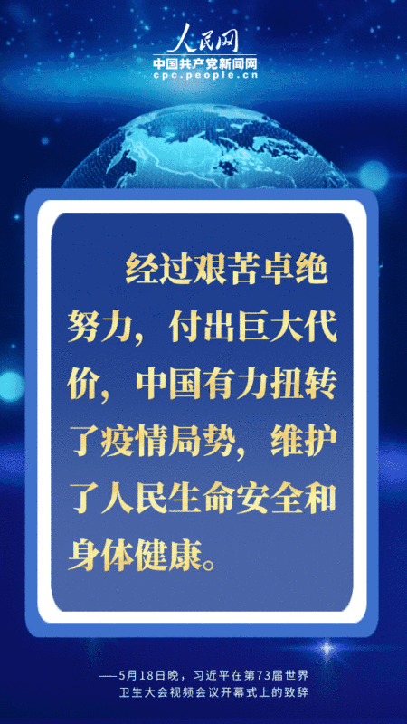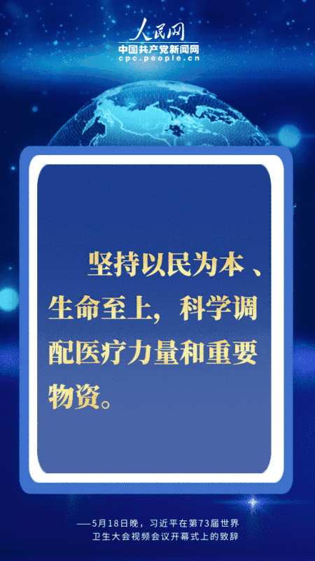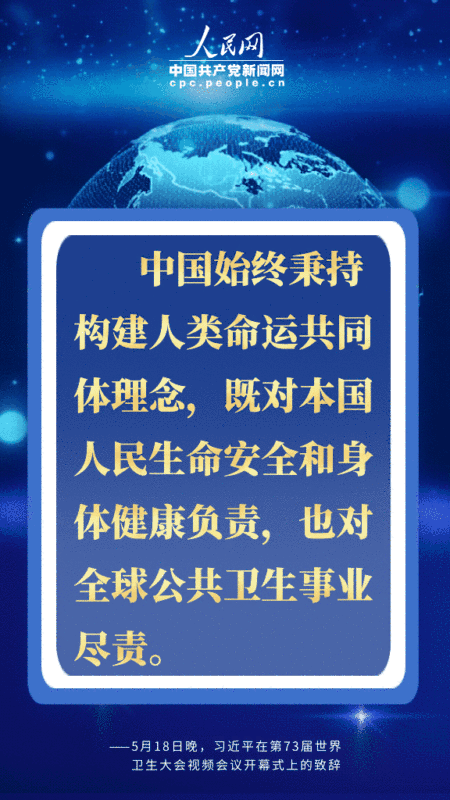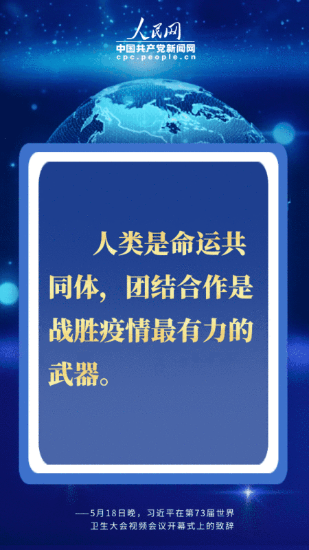 北京时间5月18日晚,国家主席习近平在第73届世界卫生大会视频会议开幕式上发表题为《团结合作战胜疫情 共同构建人类卫生健康共同体》的致辞。习近平从共同构建人类卫生健康共同体的高度,深刻阐述中国抗疫主张,提出一系列重要倡议,对于提振全球抗疫信心,推进国际抗疫合作,擘画未来全球治理体系,具有十分重要的现实和深远意义。人民网·中国共产党新闻网用四个关键词为您梳理。 关键词一:尽己所能 ![]() 人类文明史也是一部同疾病和灾难的斗争史。病毒没有国界,疫病不分种族。当前,人类正在经历第二次世界大战结束以来最严重的全球公共卫生突发事件,中国尽己所能、毫无保留。习近平强调: 经过艰苦卓绝努力,付出巨大代价,中国有力扭转了疫情局势,维护了人民生命安全和身体健康; 中方始终本着公开、透明、负责任的态度,及时向世卫组织及相关国家通报疫情信息,第一时间发布病毒基因序列等信息,毫无保留同各方分享防控和救治经验,尽己所能为有需要的国家提供了大量支持和帮助。 关键词二:团结合作 ![]() 人类是命运共同体,团结合作是战胜疫情最有力的武器。习近平在致辞中提出全力搞好疫情防控、发挥世卫组织领导作用、加大对非洲国家支持、加强全球公共卫生治理、恢复经济社会发展、加强国际合作六点建议,并明确提出支持世界卫生组织,加强团结合作: 国际抗疫正处于关键阶段,支持世卫组织就是支持国际抗疫合作、支持挽救生命; 中国呼吁国际社会加大对世卫组织政治支持和资金投入,调动全球资源,打赢疫情阻击战; 发展中国家特别是非洲国家公共卫生体系薄弱,帮助他们筑牢防线是国际抗疫斗争重中之重; 有条件的国家要在做好常态化疫情防控的前提下,遵照世卫组织专业建议,有序开展复工复产复学; 共同佑护各国人民生命和健康,共同佑护人类共同的地球家园,共同构建人类卫生健康共同体。 关键词三:科学专业 ![]() 疫情还在蔓延,防控仍需努力。习近平在致辞中多次提到“科学”: 针对全力搞好疫情防控问题,习近平表示,要坚持以民为本、生命至上,科学调配医疗力量和重要物资,在防护、隔离、检测、救治、追踪等重要领域采取有力举措,尽快遏制疫情在全球蔓延态势,尽力阻止疫情跨境传播; 针对疫苗药物研发国际合作等问题,习近平表示,将继续支持各国科学家们开展病毒源头和传播途径的全球科学研究; 谈到加强全球公共卫生治理问题时,习近平表示,中国支持在全球疫情得到控制之后,全面评估全球应对疫情工作,总结经验,弥补不足。并指出:“这项工作需要科学专业的态度”。 关键词四:责任担当 ![]() “中国始终秉持构建人类命运共同体理念,既对本国人民生命安全和身体健康负责,也对全球公共卫生事业尽责。”习近平在致辞中提出五大实际举措: 中国将在两年内提供20亿美元国际援助,用于支持受疫情影响的国家特别是发展中国家抗疫斗争以及经济社会恢复发展; 中国将同联合国合作,在华设立全球人道主义应急仓库和枢纽,努力确保抗疫物资供应链,并建立运输和清关绿色通道; 中国将建立30个中非对口医院合作机制,加快建设非洲疾控中心总部,助力非洲提升疾病防控能力; 中国新冠疫苗研发完成并投入使用后,将作为全球公共产品,为实现疫苗在发展中国家的可及性和可担负性作出中国贡献; 中国将同二十国集团成员一道落实“暂缓最贫困国家债务偿付倡议”,并愿同国际社会一道,加大对疫情特别重、压力特别大的国家的支持力度,帮助其克服当前困难。 |