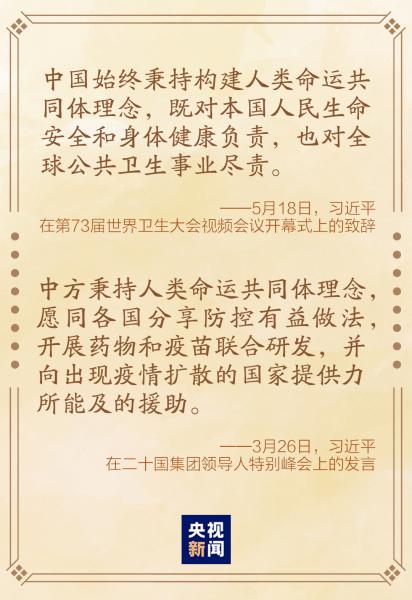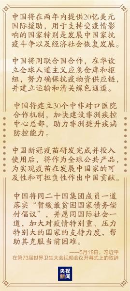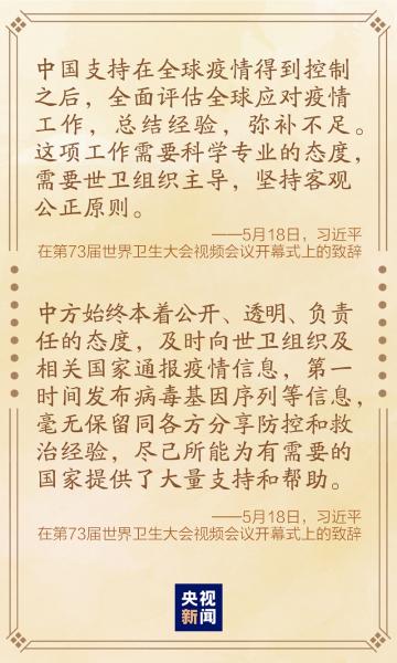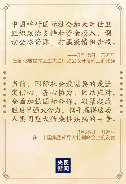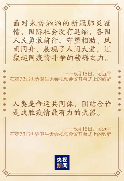 ![]() 5月18日晚,国家主席习近平在第73届世界卫生大会视频会议开幕式上发表题为《团结合作战胜疫情 共同构建人类卫生健康共同体》的致辞。这是继3月26日晚,在二十国集团领导人应对新冠肺炎特别峰会发表重要讲话之后,习近平主席再次以视频方式参加国际会议。 习近平强调,面对新冠肺炎疫情这场第二次世界大战结束以来最严重的全球公共卫生突发事件,各国人民勇敢前行,守望相助、风雨同舟。中国坚持以民为本、生命至上,始终本着公开、透明、负责任态度,始终秉持构建人类命运共同体理念,既对本国人民生命安全和身体健康负责,也对全球公共卫生事业尽责。 习近平主席从共同构建人类卫生健康共同体的高度,深刻阐述中国抗疫主张,提出一系列重要倡议,对于提振全球抗疫信心,推进国际抗疫合作,擘画未来全球治理体系,具有十分重要的现实和深远意义。 ![]() 当前全球新冠肺炎疫情形势十分复杂严峻,全力搞好疫情防控是当务之急。 “我们要坚持以民为本、生命至上,科学调配医疗力量和重要物资,在防护、隔离、检测、救治、追踪等重要领域采取有力举措,尽快遏制疫情在全球蔓延态势,尽力阻止疫情跨境传播。要加强信息分享,交流有益经验和做法,开展检测方法、临床救治、疫苗药物研发国际合作,并继续支持各国科学家们开展病毒源头和传播途径的全球科学研究。”习近平主席在致辞中对于各国加强合作、合力抗击疫情提出了具体建议。 此前,习近平多次强调国际社会要加强合作,同世界卫生组织紧密合作,有效开展联防联控国际合作,凝聚起战胜疫情的强大合力。 世界卫生组织是协调推进全球抗疫合作的核心力量。在谭德塞总干事带领下,世卫组织为领导和推进国际抗疫合作作出了重大贡献,国际社会对此高度赞赏。习近平表示,当前,国际抗疫正处于关键阶段,支持世卫组织就是支持国际抗疫合作、支持挽救生命。 中国坚定支持世卫组织发挥领导作用,已向世卫组织捐款5000万美元,并尽一切努力为其他国家在华采购医疗防护物资提供便利。 ![]() ![]() 人类终将战胜疫情,但重大公共卫生突发事件对人类来说不会是最后一次。习近平表示,要针对这次疫情暴露出来的短板和不足,完善公共卫生安全治理体系,提高突发公共卫生事件应急响应速度,建立全球和地区防疫物资储备中心。 加强全球公共卫生治理,需要国际社会通力合作,补齐短板。当前,发展中国家特别是非洲国家公共卫生体系薄弱,容易遭受严重冲击。帮助他们筑牢防线不仅可以拯救生命,也可延缓病毒的全球传播,为全球公共卫生系统构建“防火墙”。 习近平表示,我们应该向非洲国家提供更多物资、技术、人力支持。目前,中国已向50多个非洲国家和非盟交付了大量医疗援助物资,专门派出了5个医疗专家组。常驻非洲的46支中国医疗队正在投入当地的抗疫行动。 疫情是我们的共同敌人。正如习近平主席在二十国集团领导人应对新冠肺炎特别峰会上的倡议,各国“要探讨建立区域公共卫生应急联络机制,提高突发公共卫生事件应急响应速度”。 ![]() ![]() 疫情既是一次大战,也是一次大考。对中国如是,对世界亦然。 习近平主席深刻指出:“人类是命运共同体,团结合作是战胜疫情最有力的武器。这是国际社会抗击艾滋病、埃博拉、禽流感、甲型H1N1流感等重大疫情取得的重要经验,是各国人民合作抗疫的人间正道。” 风雨同舟,大道不孤。新冠肺炎疫情发生初期,中方第一时间向世卫组织报告疫情,第一时间同世界各国分享新冠病毒基因序列,第一时间建立疫情信息定期沟通机制。 在中国最困难的时候,国际社会许多成员给予了真诚的帮助和支持,中国人民始终铭记并珍视这份友谊。习近平主席的一封封慰问电,陆续发往意大利、伊朗、韩国、西班牙、塞尔维亚、德国、法国等国国家元首和政府首脑以及欧洲理事会和欧盟委员会负责人。 病毒没有国界,疫情面前任何国家都不能独善其身。唯有齐心协力,方能战胜疫情、稳定经济、恢复秩序。 ![]() ![]() 为推进全球抗疫合作,习近平主席在致辞中宣布了中国支持全球抗疫的五大举措。这些举措实实在在,针对的是当前和今后一个时期全球抗疫的重点和难点,彰显了对全球公共卫生事业尽责的担当。 ![]() 早在疫情暴发之初,中国就基于人类命运共同体理念,坚定支持他国抗击疫情的努力,提供力所能及的帮助。 3月15日晚,塞尔维亚总统武契奇宣布进入国家紧急状态。数日后,中国援助塞尔维亚抗疫医疗专家组携中国政府捐赠的医疗物资抵达。对于中国医疗专家组的帮助,武契奇这样评价:“他们的到来使塞尔维亚人觉得自己不再孤单。” 3月19日,俄罗斯总统普京同习近平主席通电话时表示,中国向遭受疫情的国家及时伸出援助之手,为国际社会树立了良好典范。 对各国遭受的疫情重击,中国感同身受,尽己所能,慷慨解囊。目前,中国同全球180个国家、10多个国际和地区组织分享疫情防控和诊疗方案,同160多个国家和国际组织举行疫情防控视频交流会议;先后派出20多支医疗专家组,向150多个国家和国际组织提供急需的抗疫物资援助。 ![]() “让我们携起手来,共同佑护各国人民生命和健康,共同佑护人类共同的地球家园,共同构建人类卫生健康共同体!”全人类的大考面前,习近平主席发出团结合作战胜疫情的全球倡议,传递了中国