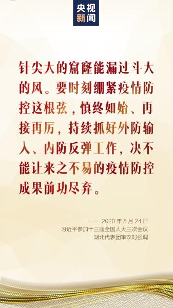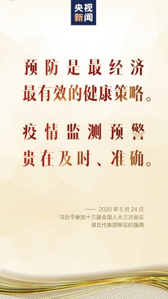 习近平24日下午在参加十三届全国人大三次会议湖北代表团审议时强调,防范化解重大疫情和突发公共卫生风险,事关国家安全和发展,事关社会政治大局稳定。 ![]() 形势判断 境外疫情扩散蔓延势头仍然没有得到有效遏制,国内个别地区聚集性疫情仍然存在,湖北有时还出现散发零星确诊病例,无症状感染者每天还有新增。 作为全国疫情最重、管控时间最长的省份,湖北经济重振面临较大困难。同时,湖北经济长期向好的基本面没有改变,多年积累的综合优势没有改变,在国家和区域发展中的重要地位没有改变。 ![]() 防控要求 针尖大的窟窿能漏过斗大的风。要时刻绷紧疫情防控这根弦,慎终如始、再接再厉,持续抓好外防输入、内防反弹工作,决不能让来之不易的疫情防控成果前功尽弃。 ![]() 部署湖北疫情防控和经济社会发展工作 1.要全力做好常态化疫情防控工作,坚持常态化精准防控和局部应急处置有机结合,加强社区精准防控,扩大检测范围。 2.要加快复工复产、复商复市,围绕重点产业链、龙头企业、重大投资项目精准施策,帮助解决企业特别是中小微企业面临的实际困难,抓紧出台和落实各项刺激消费的措施。 3.要切实做好“六保”工作,做好高校毕业生、农民工等重点群体就业,做好保基本民生工作,帮助群众解决社保、医保、就学等方面的实际困难,落实好特殊困难群众兜底保障工作,坚决完成剩余贫困人口脱贫任务,防止因疫致贫或返贫。 4.要高度重视化解可能出现的“疫后综合症”,继续做好治愈患者康复和心理疏导工作以及病亡者家属抚慰工作,妥善解决因疫利益受损群众的合理诉求。 5.中央和国家机关单位、中央企业要继续加大对湖北疫后重振支持力度。 ![]() 补短板、堵漏洞、强弱项 1.改革疾病预防控制体系:预防是最经济最有效的健康策略。要立足更精准更有效地防,优化完善疾病预防控制机构职能设置,创新医防协同机制,强化各级医疗机构疾病预防控制职责,督促落实传染病疫情和突发公共卫生事件报告责任,健全疾控机构与城乡社区联动工作机制。 2.提升疫情监测预警和应急响应能力:疫情监测预警贵在及时、准确。要改进不明原因疾病和异常健康事件监测机制,提高评估监测敏感性和准确性,建立智慧化预警多点触发机制,健全多渠道监测预警机制,及时研判风险,加强传染病等重大疫情应对处置能力建设和培训演练,改善疾病预防控制基础条件,增强一线疾控人员的荣誉感和使命感。 ![]() 3.健全重大疫情救治体系:建立健全分级、分层、分流的重大疫情救治机制,加强国家医学中心、区域医疗中心等基地建设,健全重大疾病医疗保险和救助制度,优化科研攻关体系和布局,抓好《关于健全公共卫生应急物资保障体系的实施方案》组织落实。 4.完善公共卫生应急法律法规:健全权责明确、程序规范、执行有力的疫情防控执法机制,普及公共卫生安全和疫情防控相关法律法规,提高全民知法、懂法、守法、护法、用法意识和公共卫生风险防控意识。 5.深入开展爱国卫生运动:新时代开展爱国卫生运动,要坚持预防为主,创新方式方法,推进城乡环境整治,完善公共卫生设施,大力开展健康知识普及,倡导文明健康、绿色环保的生活方式,把全生命周期管理理念贯穿城市规划、建设、管理全过程各环节,加快建设适应城镇化快速发展、城市人口密集集中特点的公共卫生体系,深入持久开展农村人居环境整治。 出门佩戴口罩、分餐公筷等做法要推广开来、坚持下去 习近平指出,现在,出门佩戴口罩、垃圾分类投放、保持社交距离、推广分餐公筷、看病网上预约等,正在悄然成为良好社会风尚。这些健康文明的做法要推广开来、坚持下去。 |