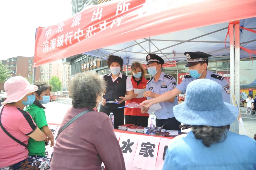 座谈会后,中北派出所联合天津滨海农村商业银行、碧水家园居委会在中北镇碧水家园甜水街开展“面对面”防范宣传活动。