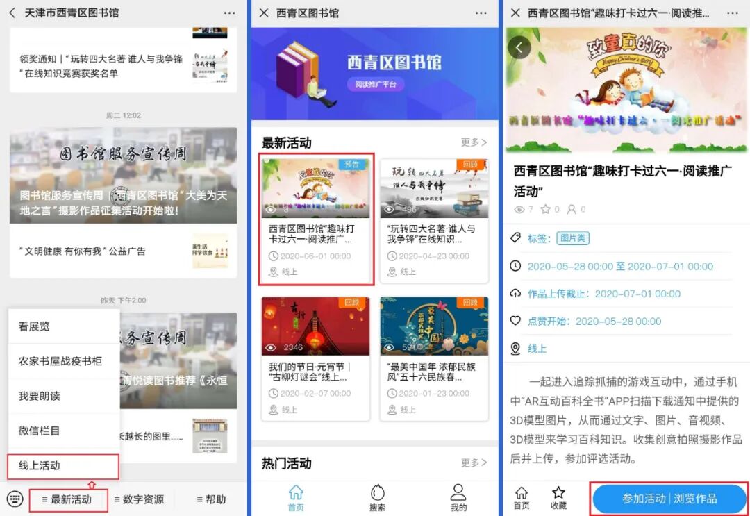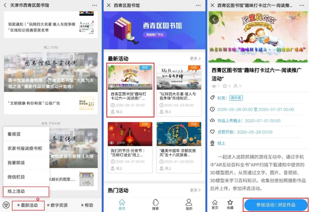 ![]() 万物复苏,正是走进大自然的好时节,带着我们的“3D小宠物”走进西青文化特色的地方,在游中了解地域文化知识,在玩中学习百科知识(例如:西青区图书馆、石家大院、热带观光植物园、京杭大运河杨柳青段、水高庄园,及西青境内公园、游乐场所等等)。通过“AR互动百科全书”APP中的3D模型进行趣味打卡创意拍照摄影,小读者在通过AR技术的体验中,从不同角度感受不一样的风景,同时激发孩子的丰富的创造力和想象力。 一活动时间 作品拍摄上传起止时间:2020年6月1日-2020年6月30日 礼品领取时间及方式:待定(活动结束后,图书馆根据疫情情况在微信公众号上发布领奖通知,请关注图书馆微信公众号) 二活动内容 1、读者扫码关注西青区图书馆公众号,扫描二维码下载“AR互动百科全书”APP; ![]() 西青区图书馆微信公众号 ![]() 2、家长带领孩子一起了解“AR互动百科全书”APP的操作方法; 3、一起进入追踪抓捕的游戏互动中,通过手机中“AR互动百科全书”APP扫描下载通知中提供的3D模型图片,从而通过文字、图片、音视频、3D模型来学习百科知识; 4、一起通过AR(增强现实)技术与西青特色地方进行打卡创意拍照摄影; 5、收集创意拍照摄影作品后,在活动期限内上传到图书馆活动平台。方法如下:打开西青区图书馆微信公众号,点击最新活动-线上活动按钮参加活动,选择“趣味打卡过六一阅读推广活动”,点击参加活动,上传作品(首次登录需要输入手机号并实名认证,请填写真实姓名),上传作品后台审核通过后才能在前端显示,请勿一幅作品多次上传,每名读者只能参加一次活动,多投只选择最先上传的作品。活动结束后,图书馆统计有效作品,根据疫情情况在公众号上发布领奖通知,领奖安排另行通知,请关注图书馆微信公众号(数量有限,名单按照作品上传时间排序)。 ![]() ![]() ![]() “AR”互动百科全书APP操作说明 ![]() ![]() “3D小宠物”创意推荐打卡地:西青区人文风景、建筑,以下打卡地点仅供参考,与排名无关,也可以拍摄西青区内其他人文风景和建筑。 1天津市西青区图书馆 ![]() 2石家大院 ![]() 3热带观光植物园 ![]() 4京杭大运河杨柳青段 ![]() 5水高庄园 ![]() 拍照范例 ![]() ![]() ![]() |