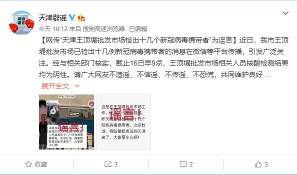 最近,一条“我市王顶堤批发市场已检出十几例新冠病毒携带者”的消息,在微信、微博等网络平台传播,引发广泛关注。 ![]() 今早,天津市互联网违法和不良信息举报中心官方微博@天津辟谣 正式辟谣,与相关部门核实。截止16日早9点,王顶堤批发市场相关人员核酸检测结果均为阴性。 ![]() 疫情防控期间,不信谣、不传谣是对社会负责,更是对自己负责。 |