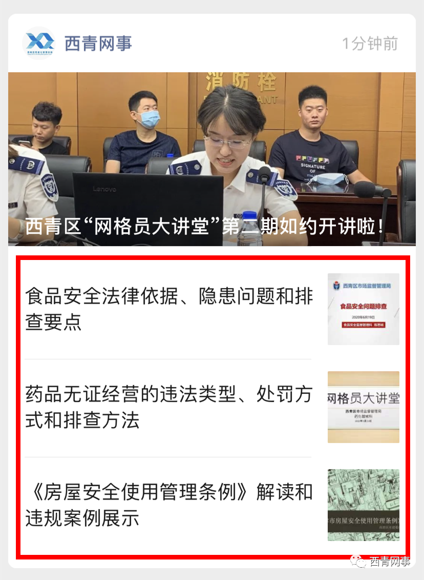 日前,西青区“网格员大讲堂”第二期如约而至。期间,来自区市场监督管理局、区住房和建设委员会的4名专业工作人员就食品安全法律依据、隐患问题和排查要点,药品无证经营的违法类型、处罚方式和排查方法,以及《天津市房屋安全使用管理条例》 、《天津市国有土地上房屋征收与补偿规定》解读和违规案例展示等内容,进行了深入细致的讲解。全区528名网格员参加了培训。 ![]() 今天没有参加培训的网格员也不要着急,区网格中心已将培训内容同步上传至“西青网事”微信公众号。您可以在本期推送的“其他文章”中查看学习。 ![]() 同时,您也可以进入“西青网事”微信公众号,点击下方菜单栏“微网格”-“网格课堂”查看往期培训内容。 |