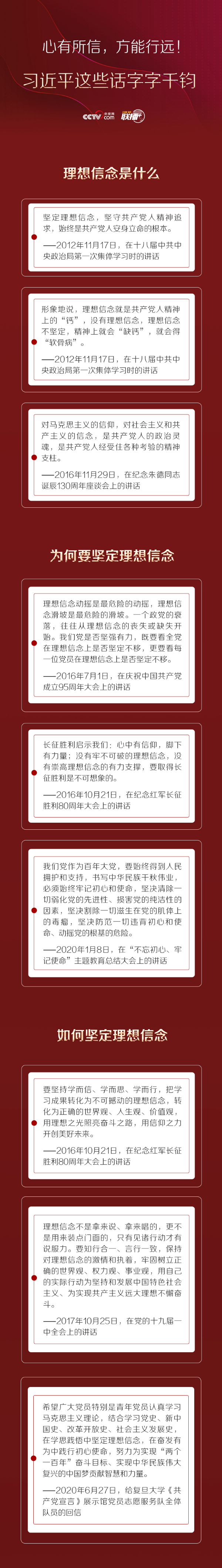 “心有所信,方能行远。面向未来,走好新时代的长征路,我们更需要坚定理想信念、矢志拼搏奋斗。”近日,习近平总书记给复旦大学《共产党宣言》展示馆党员志愿服务队全体队员回信。 纸短情长。在这封300余字的回信中,习近平总书记对全国广大党员特别是青年党员提出殷切期望,他希望大家“在学思践悟中坚定理想信念,在奋发有为中践行初心使命”。 从回答“理想信念是什么”,到阐述“为何要坚定理想信念”,再到解答“如何坚定理想信念”……党的十八大以来,习近平总书记多次在不同场合对理想信念进行深入阐释,言简意深,《联播+》与您一同学习、领会。 ![]() |