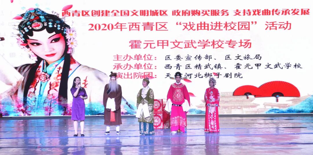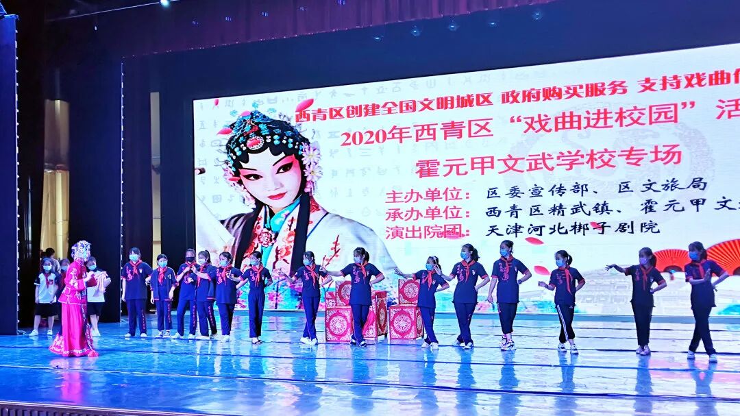 近日,由西青区委宣传部、区文旅局主办,西青区精武镇政府、霍元甲文武学校承办,天津河北梆子剧院演出的“2020年西青区‘戏曲进校园’活动”在霍元甲文武学校精武剧场举行。剧中演员们多样的服饰,个性化的声音以及独具特色的动作让孩子们眼前一亮。特别是他们精彩的表演,赢得了在场同学们的阵阵掌声。