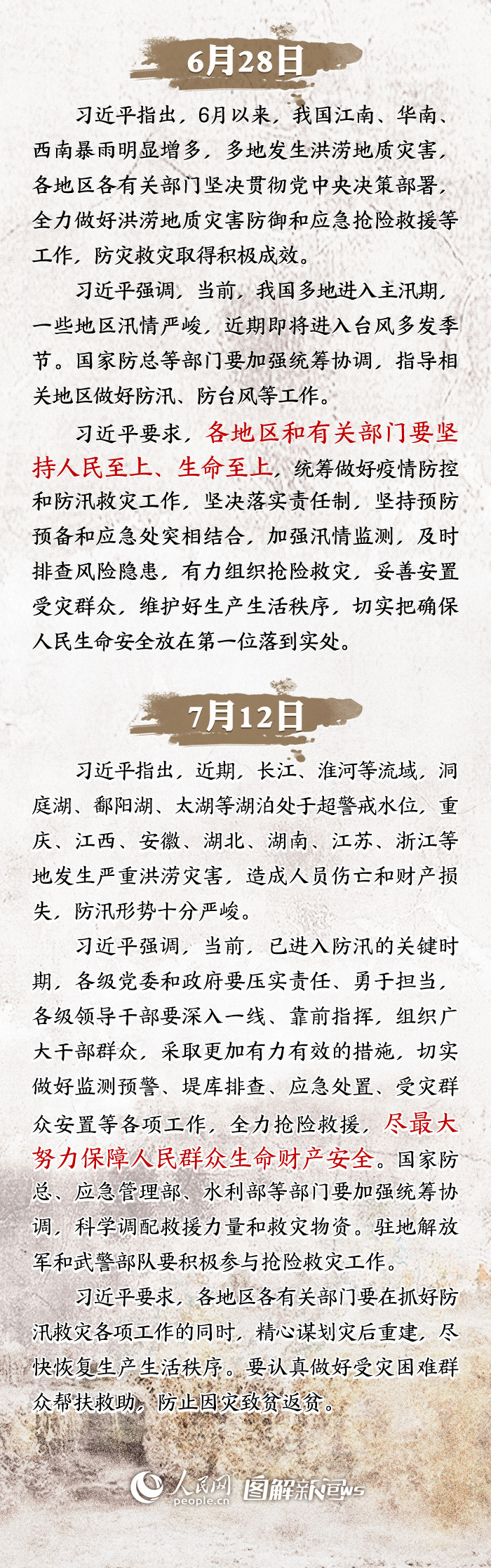 入汛以来,习近平总书记先后两次对防汛救灾工作作出重要指示,强调要“尽最大努力保障人民群众生命财产安全”。当前防汛已进入关键时期,各地各部门正深入贯彻落实习近平总书记重要指示精神,全力做好防汛抗洪工作,守护人民群众生命财产安全。 两次重要指示 强调生命至上 面对严峻的防汛形势,习近平总书记高度重视,于6月28日和7月12日先后两次对防汛救灾工作作出重要指示。“人民至上、生命至上”,习近平要求各部门坚持把确保人民群众生命财产安全放在首位,落实责任,狠抓隐患排查,强化应急预案,进一步加强监测预警、联防联动,为当前防汛抢险救灾工作指明了方向。 ![]() 多地遭遇洪灾 防汛形势严峻 3月28日入汛以来,我国南方地区汛情、灾情严重,特别是6月以来,西南地区到长江中下游地区遭受严重洪涝灾害,给人民群众生命财产安全和生产生活带来很大影响。 当前,我国即将进入“七下八上”防汛关键期,长江和太湖流域形势严峻。 四川冕宁县“6·26”特大暴雨灾害导致19人遇难、3人失联;江西多个江河站水位超1998年历史水位,鄱阳昌江问桂道圩堤、中洲圩堤、崇复圩堤等圩堤决口;綦江流域重庆段全线告急,重庆市水文监测总站发出80年以来首次洪水红色预警;湖南洞庭湖区、沅水干支流、湘江和资江部分支流42站水位超警戒,常德、岳阳、邵阳、张家界等地受灾严重;安徽歙县遭遇50年一遇的洪涝灾害,多处严重积水,道路受阻,高考语文、数学两科延期;广西融江最高水位超警戒水位5.27米,沿岸多处低洼地段被淹;浙江新安江水库9孔全开泄洪,为建成61年来首次…… 6月以来,全国共有433条河流发生超警以上洪水,其中109条超保,还有33条超历史。长江、黄河上游、珠江流域的西江和北江、太湖都发生了今年1号洪水。 截至7月13日,受洪涝灾害影响,我国已经累计紧急转移224.6万人次。27个省(区、市)3873万人次受灾,造成人员死亡失踪141人,倒塌房屋2.9万间。 多方联动抗洪 保卫生命安全 灾情发生后,多部门闻令而动、协调联动,积极开展防汛抗洪抢险救灾工作,全力以赴保卫人民群众生命财产安全。 7月13日,针对当前严峻防汛形势,国家防总决定增派6个部级工作组,由公安部、自然资源部、水利部、应急管理部、中国气象局等部委负责同志带队,赴江西、安徽、湖南、湖北、江苏、浙江、重庆等7个重点地区指导检查防汛救灾工作。截至目前,国家防总、国家减灾委已先后派出了25个工作组。 同日,财政部、应急管理部向江西、安徽、湖北、湖南、重庆五省(市)紧急拨付中央自然灾害救灾资金6亿元。此前,财政部、应急管理部已向多地下拨中央救灾资金——6月17日,向广西、广东、贵州3省(区)紧急下拨中央防汛抗旱补助资金2亿元;6月29日,向四川、贵州、湖南3省紧急预拨中央自然灾害救灾资金1.5亿元;7月8日,向安徽、江西、湖北、广西、重庆、贵州6省(区、市)下拨中央救灾资金6.15亿元,其中用于支持帮助受灾地区防汛抗洪工作4.3亿元,用于受灾群众生活救助工作1.85亿元…… 针对多地防汛救援物资短缺,国家防办、应急管理部会同国家粮食和物资储备局向多个受灾严重的地区多次调拨中央救灾物资,支持地方救灾工作。自入汛以来,已累计调拨帐篷、折叠床、被子、毛毯和毛巾被等9.3万件中央救灾物资。 水利部按照国家防总职责分工,聚焦超标洪水、水库失事、山洪灾害三大风险组织分析研判,科学调度水工程,共拦蓄洪水532亿立方米;自然资源部强化地质灾害监测预报预警,成功避让地质灾害128起,应急避险5055人;中国气象局严密监测各种灾害性天气过程,6月以来,中央气象台连续40天发布暴雨预警…… 农业农村部实行灾情日调度,坚持24小时值班制度,并于7月14日启动农业重大自然灾害二级应急响应,向江苏、安徽、江西、湖北、湖南等5个省派出抗洪救灾专家工作组,会同地方农业农村部门完善防汛救灾和灾后生产恢复技术方案。 来之即战,战之必胜。滚滚洪水当前,解放军、武警部队、消防救援队伍等也迅速投入到防汛抗洪抢险救援当中。 火箭军某部数百名官兵在江西连日奋战,成功排除鄱阳县西河东联圩港头村段、西河东联圩龙尾村段、古县渡镇向阳圩等地数十处堤坝险情;陆军部队出动多支部队7000余人赴江西九江、安徽铜陵等地参加抗洪抢险救援任务;武警广西总队柳州支队官兵在沿江居民区连夜展开清淤工作,近9小时清理淤泥和杂物近9500立方;入汛以来,国家综合性消防救援队伍共参与各类抗洪抢险救援4830起,营救遇险被困群众1.48万余人,疏散转移被困群众6.1万余人…… 生命就是一切,责任重于泰山。面对当前防汛关键期的严峻形势,多地打响了防汛抗洪“保卫战”。 在江西,全省已累计投入广大干部职工、应急抢险救援队伍、解放军武警官兵等各类防汛抗洪抢险力量31.6万人次,投入车辆、装备、救生衣2万余台(套)件。 在江苏,3.14万人对沿江和苏南地区超警戒河湖沿线进行巡堤查险,水利、应急、消防及部队落实13支队伍、6480人参与防汛抢险救援。 在湖南,自洞庭湖水位全面超警以来,湖区各地每日有近20万干部群众在水线上巡查防守,及时处置险情,紧急转移群众达25.3万人次。 在湖北黄冈,入梅以来,21万余名党员下沉防汛救灾一线。从7月10日起,又抽调1000名市直机关干部、长江沿线6县市千余名干部及146名工程技术人员,组织10