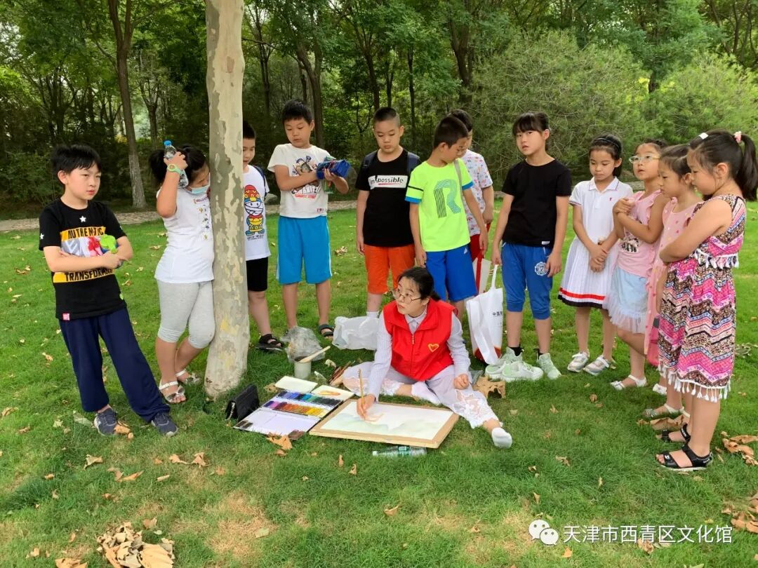 结课当天,文化馆美术老师刘晴、胡双星在王兰庄公园为大家上了一堂特别的美术课。她们通过油画、水彩画的绘画形式,为孩子们现场写生创作并讲解,让孩子们在感受大自然的同时欣赏艺术之美。