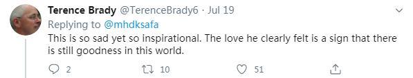 萨芬的推文很快获得超20万网友点赞,大家都被男子的孝行感动。网友纷纷留言说,“这故事让我泪流不止”、“这真令人伤心,却又鼓舞人心。”