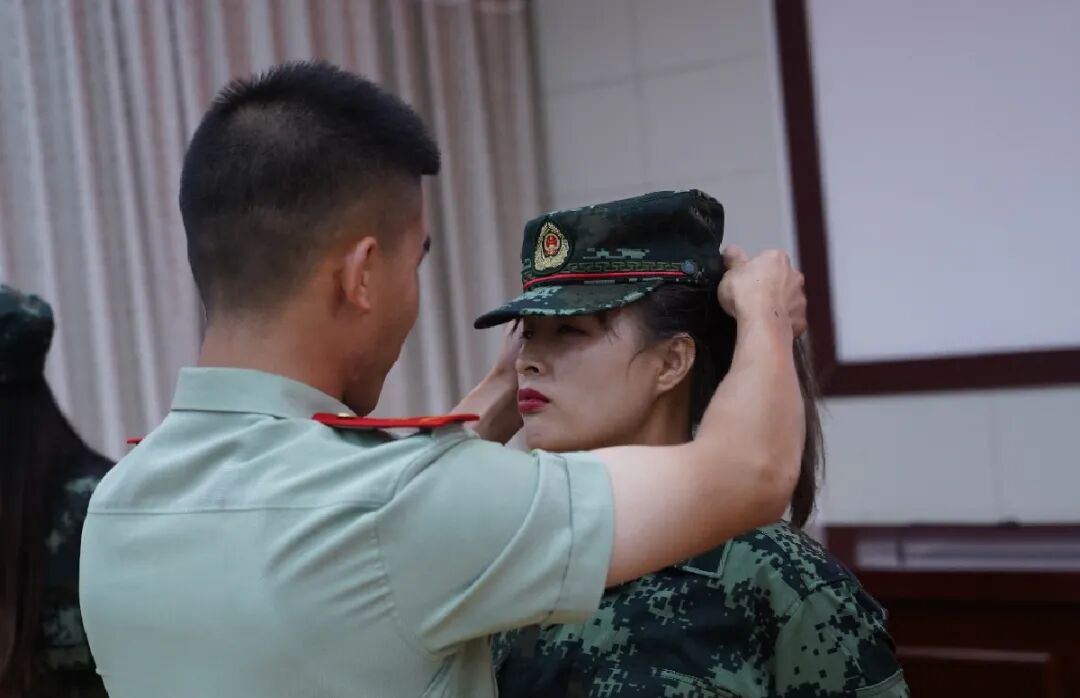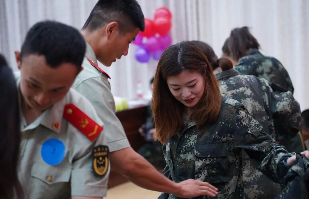 游戏环节配合默契,小姐姐们在兵哥哥的指导和帮助下将军装、军帽、军靴穿戴的有模有样。