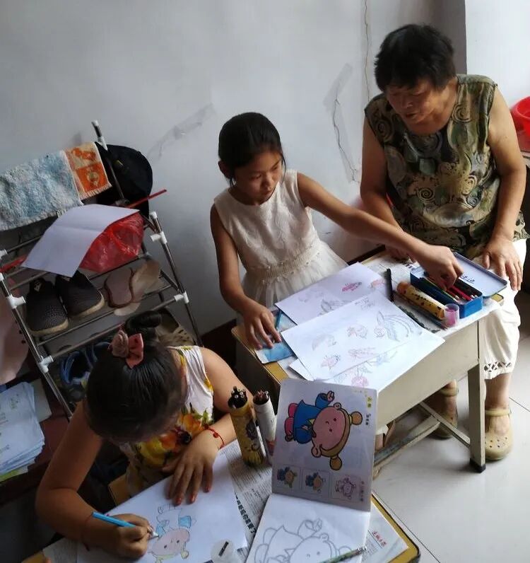 一是爱亲人。教孩子们以母亲、奶奶为主题,为她们画画、写作。为孩子们讲《大树的故事》让孩子们不再抱怨父母的远离,立足当下好好学习,做好孩子。