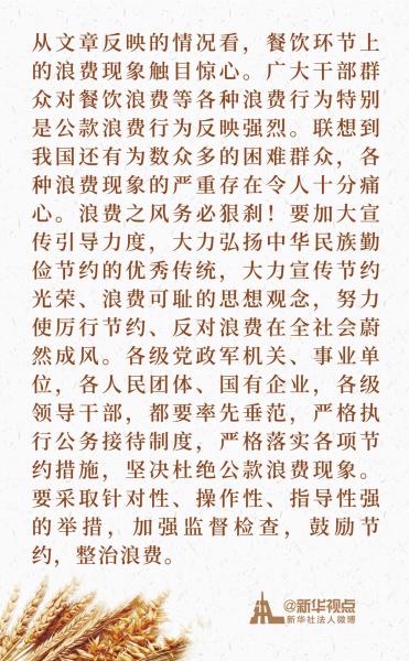 ![]() 连日来,习近平总书记关于“坚决制止餐饮浪费行为,切实培养节约习惯”的重要指示,持续在全网刷屏。 ![]() 新华社播发的消息中,回顾了党的十八大以来,习近平总书记对粮食安全问题和提倡“厉行节约、反对浪费”社会风尚作出的多次指示,特别提到了2013年1月在一份材料上的批示。 人们记忆犹新。7年前,习近平总书记在新华社一份《网民呼吁遏制餐饮环节“舌尖上的浪费”》的材料上作出批示。 ![]() 从两次公开报道可见,总书记作出指示的背景和切入点有所不同,但对“厉行节约、反对浪费”的要求是一以贯之的,而且是不断向纵深推进的。 2013年那次批示有一个大的背景,就是中央八项规定出台不久。总书记在批示中着重强调了“公款浪费行为”这个突出问题。 中共中央办公厅于当年1月20日发出的通知也指出,这是深入贯彻党的十八大精神和中央八项规定的新要求。 可以说,在总书记心目中,要使“厉行节约、反对浪费”在全社会蔚然成风,首先要抓住“关键少数”,从党员领导干部做起,从遏制公款浪费行为抓起。 这与党的十八大后,党中央全面从严治党,提出“打铁还需自身硬”,在理论上、逻辑上、实践上都是完全一致的。 经过多年持之以恒狠抓中央八项规定精神的贯彻落实,群众反映强烈的公款餐饮浪费行为得到有效遏制。 党风政风持续好转,社会风气随之改善。 ![]() 对此,前两天新华社的消息中也做了回应。值得注意的是,消息中说的是“‘舌尖上的浪费’现象有所改观”。话没有讲满,实事求是。 当群众反映强烈的公款餐饮浪费行为得到有效遏制,这一次,习近平总书记把目光投向了更长远的下一步。 习近平总书记在指示中强调:“今年全球新冠肺炎疫情所带来的影响更是给我们敲响了警钟。”这一特殊背景下,节约粮食,不仅仅是风尚和美德问题,更关乎人民生活幸福和国家长治久安。 “尽管我国粮食生产连年丰收,对粮食安全还是始终要有危机意识……”总书记的这番话体现了鲜明的问题导向和底线思维。正如他曾指出的那样:“在粮食问题上不能侥幸、不能折腾,一旦出了大问题,多少年都会被动,到那时谁也救不了我们。” 有人会问,我国粮食生产连年丰收,吃饭已经不成问题,节约粮食还重要吗? 当然,中国铺张不起,也浪费不起。 ![]() “谁知盘中餐,粒粒皆辛苦。”习近平总书记引用古诗,道出每一粒粮食都来之不易。 经历过穷苦日子,从“吃不饱、饿肚子”的岁月走过来的习近平,对珍惜粮食有着刻骨铭心的体会。 在中央农村工作会议上,他曾讲过这样一件事:媒体报道,一所大学食堂的垃圾桶里经常有白花花的馒头和米饭,清洁工看着心痛,捡起来再吃。总书记语重心长地告诫大家,“即使生活一天天好了,也没有任何权利浪费!”。 那么,下一步该怎么办?总书记从两个层面提出了要求。 一是“建立长效机制”。 从2013年之后,习近平总书记多次作出指示,突出强调刚性的制度约束、严格的制度执行、强有力的监督检查、严厉的惩戒机制…… 这一次则进一步强调,“要加强立法,强化监管,采取有效措施,建立长效机制,坚决制止餐饮浪费行为。”这是从更高层次上为餐饮浪费立下根本之法。 二是“加强宣传教育”。 对于餐桌上的浪费现象,习近平总书记曾指出,这与社会上存在的讲面子、讲排场的陋习有关。 这次特别要求“要进一步加强宣传教育,切实培养节约习惯,在全社会营造浪费可耻、节约为荣的氛围”,目的就是要在全社会的粮食观念上来一次破旧立新的变革,重拾“节俭”情怀,树立“粮食是一种紧缺资源”的爱粮、节粮新观念,让节约粮食成为永久的习惯和风气。 ![]() 一粥一饭当思来之不易,半丝半缕恒念物力维艰。 节约粮食看似是日常生活中的小节,但全民节约意识能否树立,粮食生产方式能否转变,蕴含着现代文明理念,关系着国家现代化发展的奋斗目标能否实现。 “勤俭是我们的传家宝,什么时候都不能丢掉。”中国人能否端好、端稳自己的饭碗,当从珍惜盘中餐开始。 |