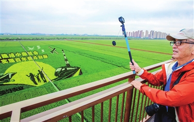 西青区王稳庄镇万亩稻田巨型彩色稻田画景观现已完成。由赤、黄、白等不同颜色绘制的“全面建成小康社会 实现百年奋斗目标”等字样图案十分壮观,游客站在丰收塔上既可观其全貌,还可将万亩稻田尽收眼底。