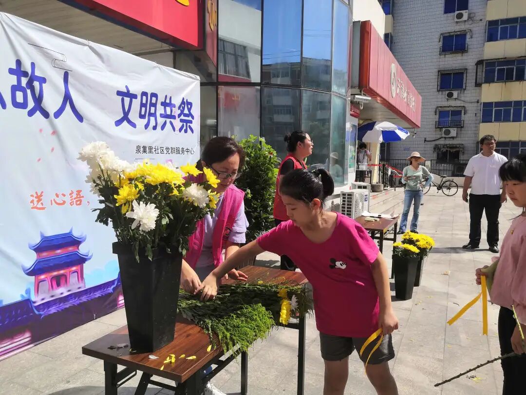 活动现场竖立“绿色中元 静思追远”签名卡片墙,社区工作人员向所有参与者发放一张文明祭祀寄语卡,泉集里社区居委会工作人员代表社区向所有参与者宣读文明祭祀倡议书,号召辖区居民不要在道路、绿地、小区等公共场所焚烧纸钱、冥币等用品,倡导鲜花祭奠、网上祭奠等健康文明的祭奠方式,倡导文明新风。大家积极响应号召,在小卡片上写上自己对亲人的追思寄语并贴在卡片墙上, 并签上了自己的名字。