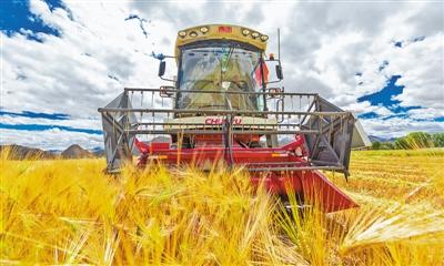 9月19日,西藏自治区日喀则市江孜县紫金乡努堆村的田地里,机械化秋收正在进行。 鲜 敢 赵 耀摄影报道