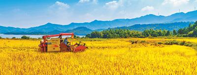 近日,江西省樟树市店下镇,粮农驾驶农机收割晚稻,田野里一派金灿灿的丰收景象。 朱 磊 陈 晗摄影报道