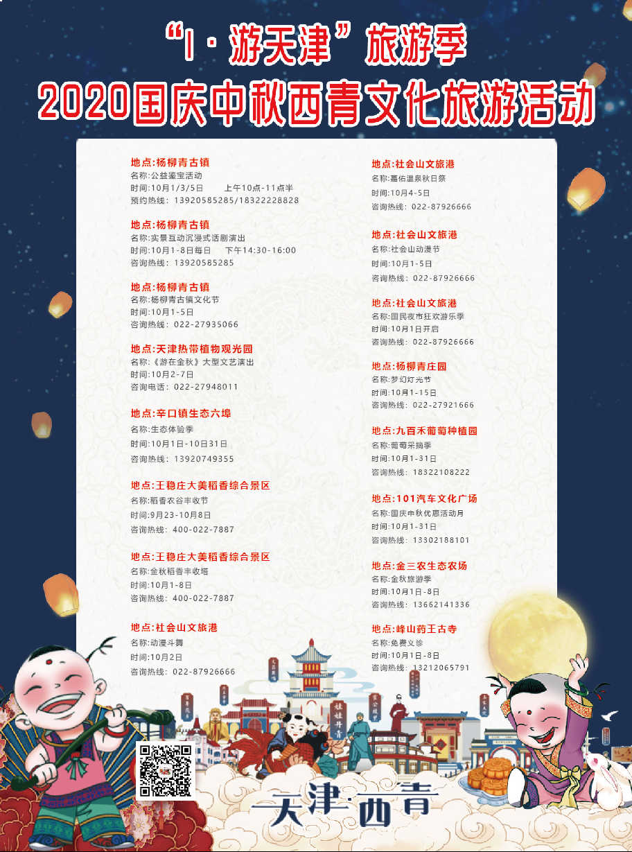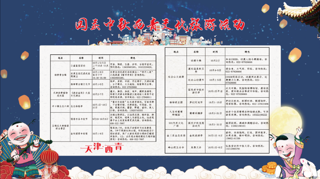 西青双节期间10个景区的16项活动旨在为游客带来全新舒适高质量的感官体验和不一样的出行玩乐,吸引游客前来旅游。