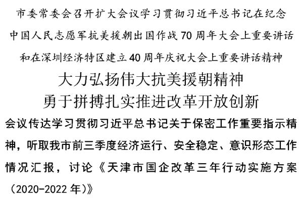 23日下午,市委书记李鸿忠主持召开市委常委会扩大会议,学习贯彻习近平总书记在纪念中国人民志愿军抗美援朝出国作战70周年大会上的重要讲话和在深圳经济特区建立40周年庆祝大会上的重要讲话精神,传达学习贯彻习近平总书记关于保密工作重要指示精神,听取关于我市前三季度经济运行、维护国家政治安全和社会稳定、意识形态工作情况汇报,讨论《天津市国企改革三年行动实施方案(2020-2022年)》。