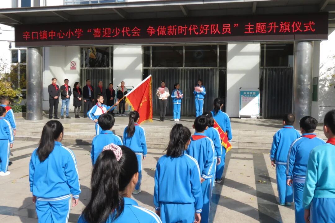 为贯彻落实习近平总书记关于少年儿童和少先队工作的寄语和希望,引导广大少年儿童以喜迎天津市第八次少代会为契机,开展组织教育、参与组织建设、养成良好习惯、争做先锋榜样,增强少年儿童组织光荣感、归属感,展示少年儿童积极面貌,为少代会召开营造积极氛围,2020年11月2日上午,西青区各学校少先队组织开展“喜迎少代会 争做新时代好队员”主题升旗仪式,西青区少工委主任万志新等同志参加了西青区辛口中心小学升旗仪式。升旗仪式中,少先队员代表用诗歌《你好,少代会!》来表达盼望少代会召开的激动喜悦之情,并向全体队员发出倡议。大队辅导员向全体队员发布21天成长记少代会特别争章活动,并带领全体队员完成第一天打卡任务——重温入队誓词。整场活动在庄严的退旗曲中落下帷幕。
