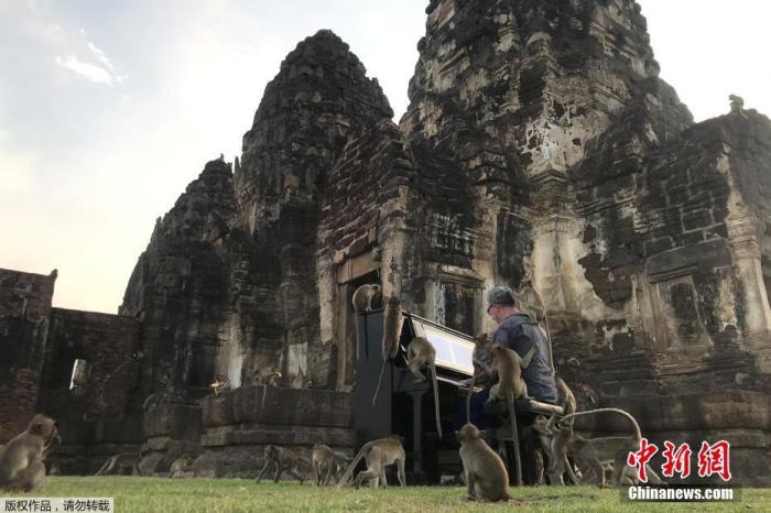 近日,泰国华富里,英国音乐家保罗·巴顿为占据华富里历史遗迹的猴群演奏钢琴。巴顿称,这场特殊的音乐会旨在引起人们对这群饥饿的猴子的重视。
