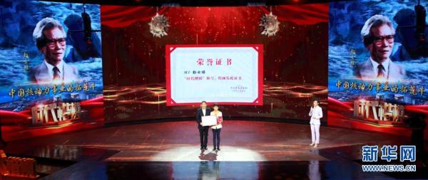 5月20日,彭士禄的女儿彭洁在“时代楷模”发布仪式上替父亲领取“时代楷模”奖章和证书。新华社记者 潘旭 摄