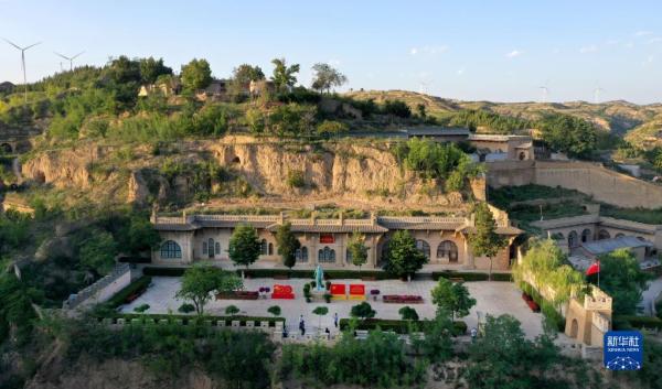 游人在陕西省榆林市米脂县杨家沟革命旧址参观(9月10日摄,无人机照片)。新华社记者 陶明 摄