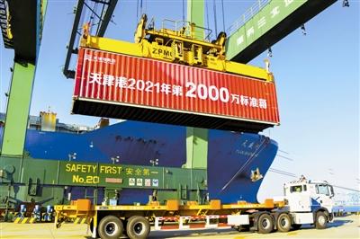12月18日上午,在天津港太平洋国际集装箱码头,随着一个集装箱吊装上中远海运“天盛河”轮,天津港年集装箱吞吐量首次突破2000万标准箱,标志着天津港集装箱事业实现跨越式发展,天津港在全球的国际枢纽港地位进一步提升,天津北方国际航运枢纽建设取得重大进展,服务国家战略和区域经济发展的能力持续增强。