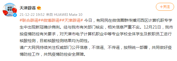 据@天津辟谣消息,今日,有网民在微信圈群传播河西区计算机职专学生中出现新冠确诊病例。经与我市有关部门核实,相关信息严重不实。12月21日,我市按疫情防控有关要求,对天津市电子计算机职业中等专业学校全体学生及教职员工进行核酸检测,目前核酸检测结果均为阴性。 请广大网民持续关注权威部门公开信息,不信谣、不传谣,按照统一部署,共同做好疫情防控工作,共筑疫情防控安全屏障。 ![]() |