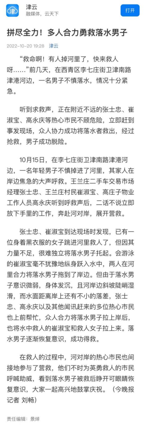 最终,落水男子被成功救起。津云、今晚报等市级媒体报道了相关新闻: ![]() 天津西青